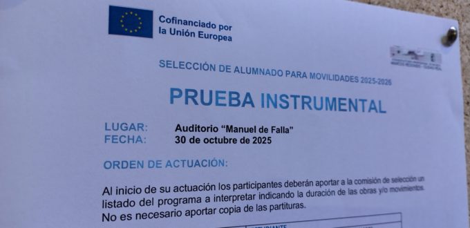 Ya está disponible el orden de actuación de la prueba instrumental Erasmus+ que tendrá lugar este jueves, 30 de octubre de 2025, en el Auditorio “Manuel de Falla” del conservatorio: ORDEN DE ACTUACIÓN PRUEBA INSTRUMENTAL E+ 25-26