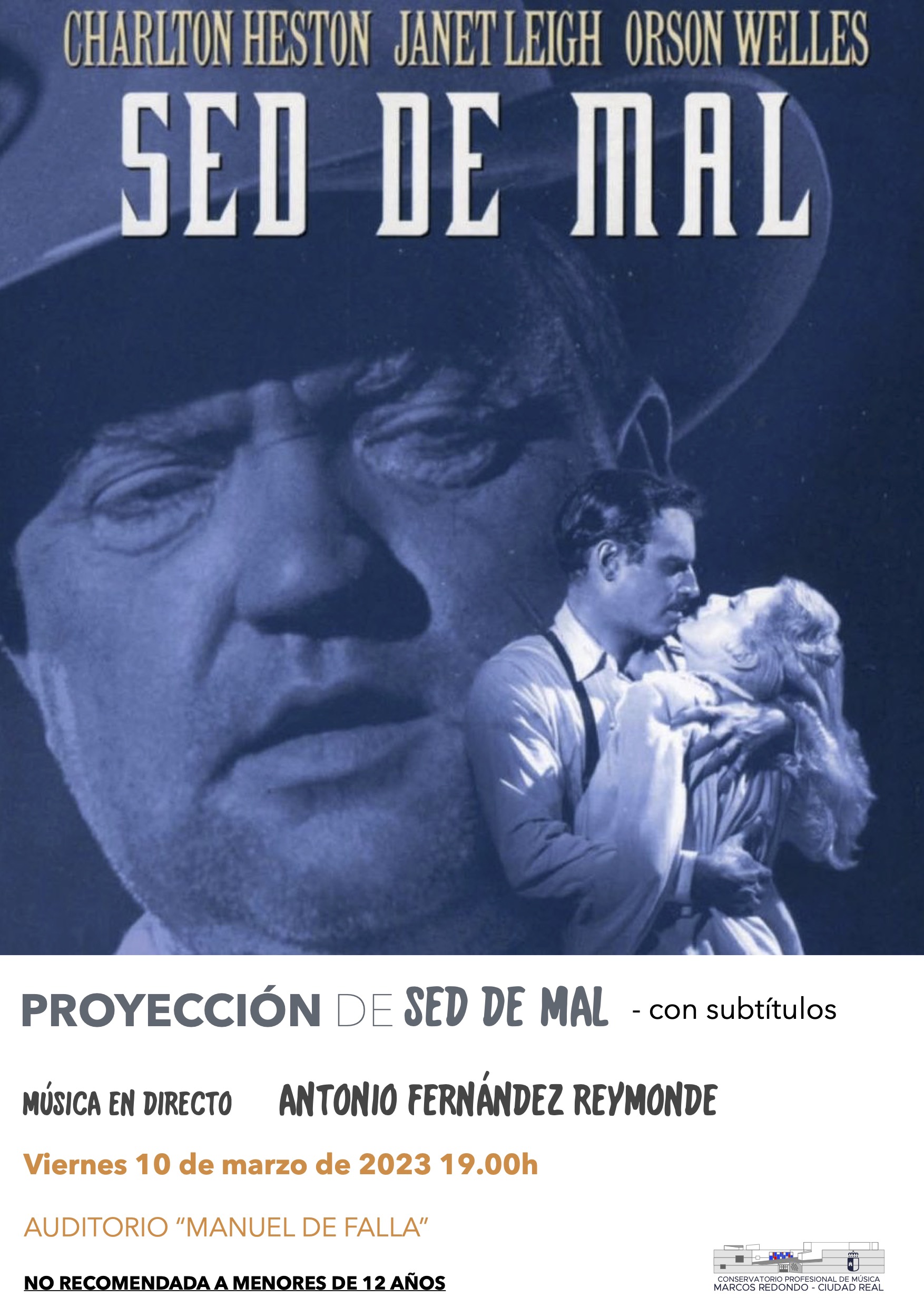 El próximo viernes 10 de marzo a las 19h en el Auditorio “Manuel de Falla”, se proyectará la película “Sed de Mal” – con subtítulos y música improvisada en directo por Antonio Fernández Reymonde. No recomendada para menores de 12 años.